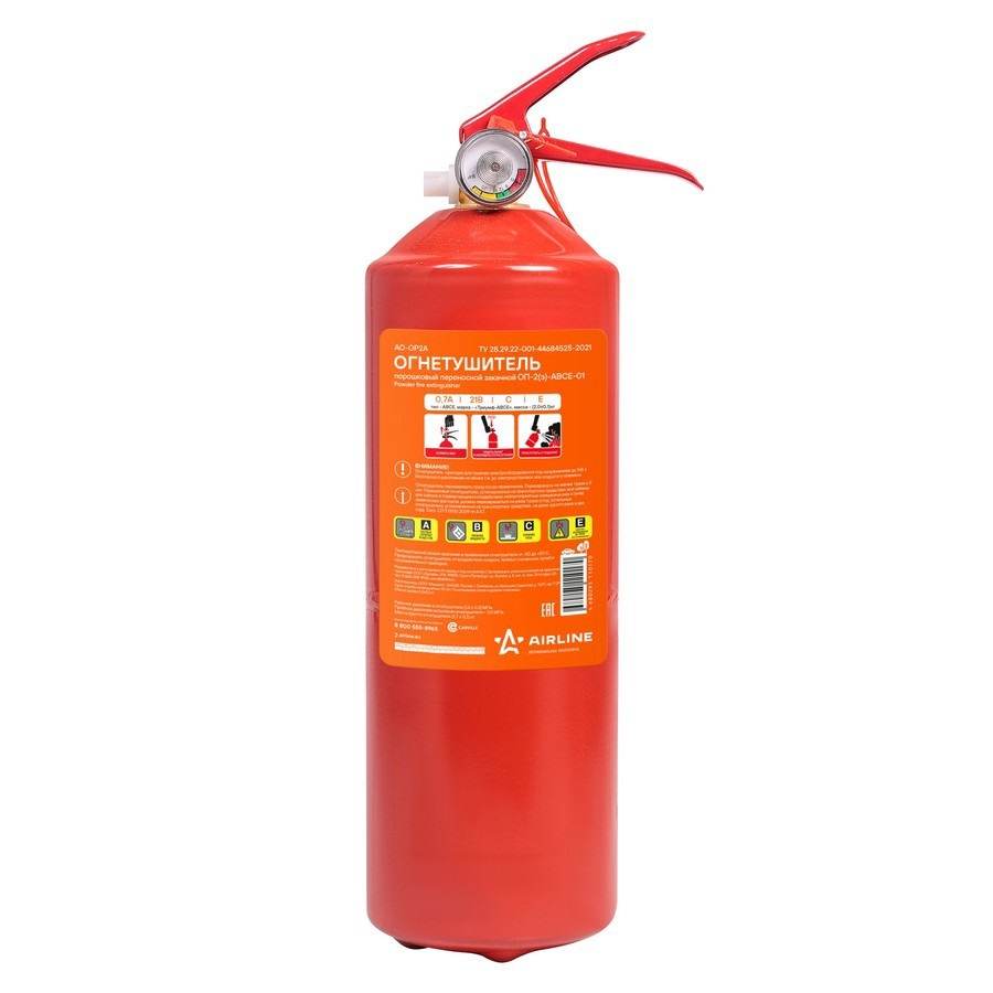 | Огнетушитель порошковый (AIRLINE) ОП2 ABCE (AO-OP2A)  Огнетушитель ОП-2 (ABCE) предназначен для защиты помещений производственного и хозяйственного назначения, применим на автомобильном, железнодорожном, речном транспорте и в бытовых условиях в качестве первичного средства тушения пожаров классов А (твердых горючих веществ), В (жидких горючих веществ), С (газообразных горючих веществ) и электроустановок, находящихся под напряжением до 1000 В. Огнетушитель не предназначен для тушения загораний щелочных и щелочноземельных металлов и материалов, горение которых может происходить без доступа воздуха. Огнетушитель является изделием многоразового пользования, подлежит перезарядке после каждого применения. - Габариты (мм): 110x110x360